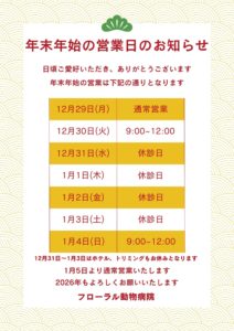 12月31日〜1月3日はトリミング・ホテルもお休みとなりますのでご了承ください。